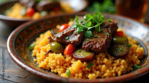 A vibrant bowl of Moroccan couscous garnished with grilled meat, olives, and fresh herbs, offering a colorful and delicious meal presentation