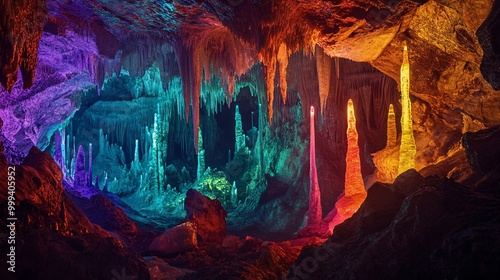 A vibrant cave illuminated with colorful lights, showcasing stunning stalactites and stalagmites in a mesmerizing underground landscape.