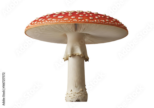 A vibrant, close-up image showcases a stunning fly agaric mushroom, with its characteristic red cap dotted with white spots, atop a smooth white stalk against a pure black background.