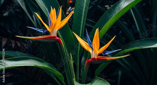 A vibrant close-up of two exotic Bird of Paradise flowers blooming among lush, dark green tropical foliage