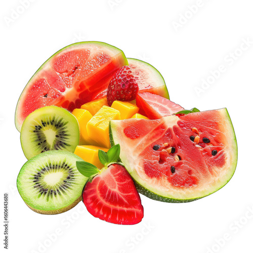 A vibrant close-up showcases a medley of fresh, juicy fruits watermelon, kiwi, mango, and strawberries. The pieces are artfully arranged, highlighting their natural colors and textures