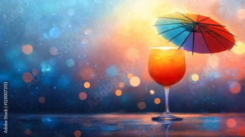 A vibrant cocktail adorned with a colorful umbrella stands against a dreamy backdrop of blurred lights, perfect for summer-themed promotions, beach parties, or tropical events,