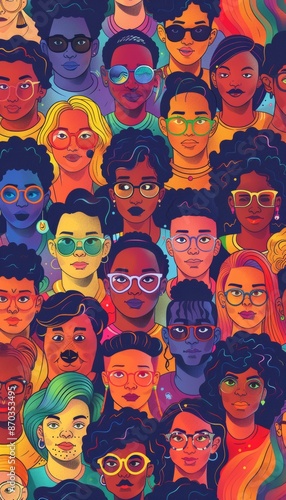 A vibrant collage of diverse faces, each with unique features and expressions, united in a tapestry of color and individuality.