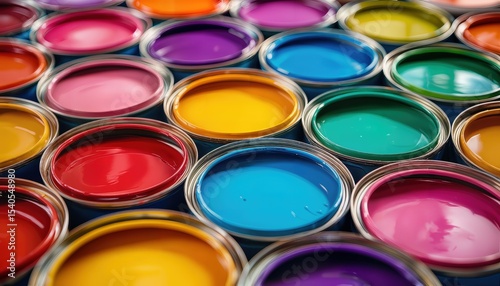 a vibrant collection of colorful paint cans arranged in a visually appealing pattern, showcasing a wide spectrum of hues.