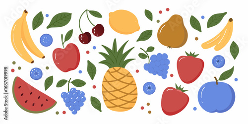 A vibrant collection of fresh fruits and green leaves arranged in a playful pattern on a white background