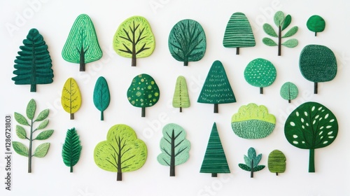 A vibrant collection of green trees and foliage created from felt, showcasing various shades and textures in a playful design.