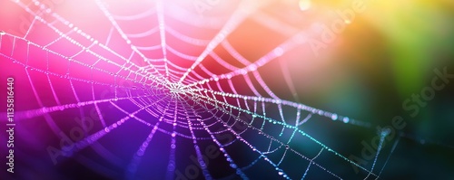 A vibrant, colorful close-up of a spider web shimmering with dew and light, creating an enchanting, ethereal atmosphere.