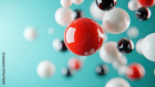 A vibrant composition of floating spheres in red, white, and black colors creates a captivating visual experience on a soothing turquoise background, ideal for abstract themes.