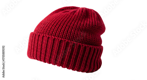 A vibrant crimson beanie with ribbed knit texture is presented against a stark black background.