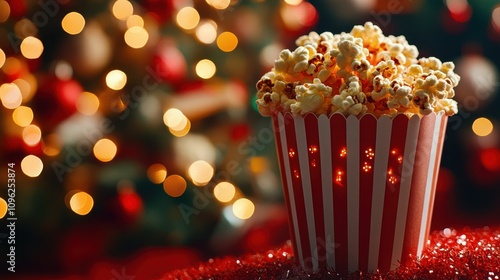 A vibrant cup of popcorn is prominently placed in front of a beautifully decorated Christmas tree adorned with colorful lights and ornaments, creating a festive atmosphere
