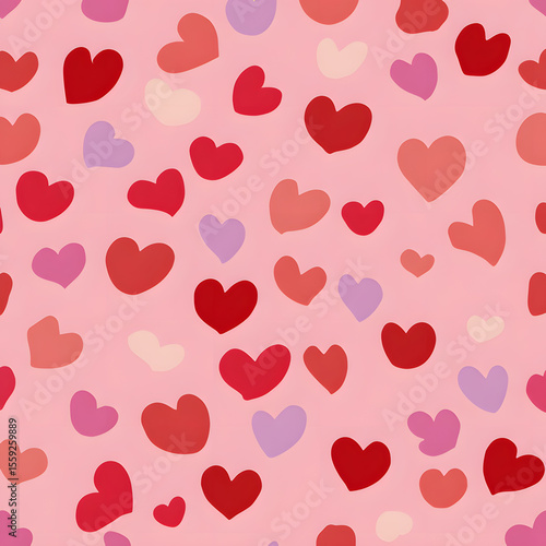 A vibrant design featuring an array of hearts in various shades of red, pink, and purple scattered across a soft pink background. Ideal for Valentine's Day or love-themed projects