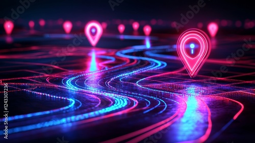A vibrant, digital landscape showcasing glowing location pins on a winding path, emphasizing navigation and connectivity in a futuristic style.