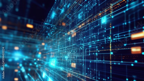A vibrant digital network of glowing lines and nodes, symbolizing advanced technology and data flow in a futuristic environment.