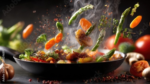 A vibrant dish of fresh vegetables being stirred in a pan, showcasing colors and textures of healthy cuisine.