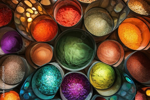 A Vibrant Display of Colorful Spices in Containers, Showcasing an Array of Textures and Shades in a Market Setting, Evoking Sensory Experiences and Culinary Inspiration