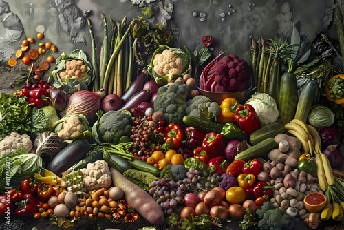 A vibrant display of fresh vegetables, showcasing a variety of shapes and colors, including greens, reds, and yellows, arranged artistically.