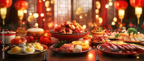A vibrant display of traditional Asian cuisine featuring various dishes, beautifully arranged, highlighting the rich colors and textures of delectable ingredients.