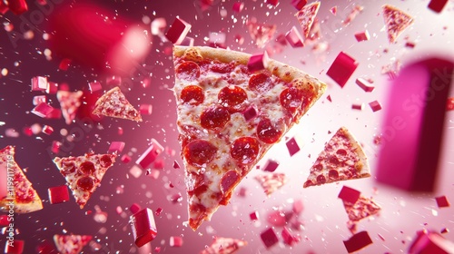 A vibrant, dynamic image of floating pepperoni pizza slices surrounded by colorful geometric shapes, creating a playful and energetic atmosphere.