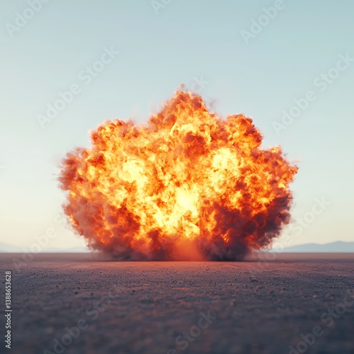 A vibrant explosion bursts in a clear sky, creating a dramatic display of flames and smoke against a barren landscape.