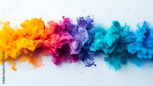 A vibrant explosion of color in a smoke-like effect, showcasing orange, pink, purple, and blue hues against a clean white background, perfect for creative projects.