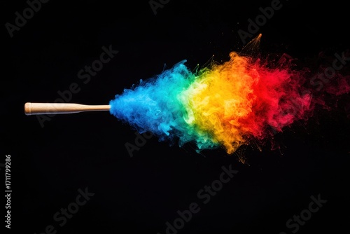 A vibrant explosion of colorful smoke emanates from a baseball bat against a black background, creating a dynamic and artistic visual effect.