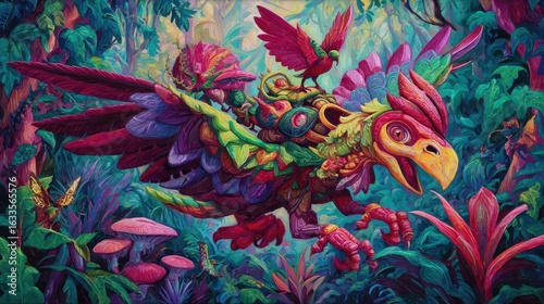 A vibrant, fantastical creature takes flight amidst a lush jungle landscape.