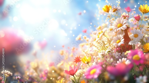 A vibrant field filled with colorful flowers under a bright sky, creating a whimsical and serene atmosphere.