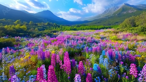 A vibrant field of colorful wildflowers with mountains in the background under a bright blue sky with fluffy clouds.