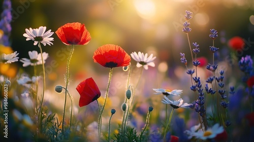 A vibrant field of wildflowers illuminated by warm sunlight, showcasing nature's beauty.