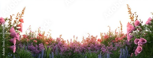 A vibrant floral garden filled with pink, purple, and orange blossoms in lush green foliage under bright natural light
