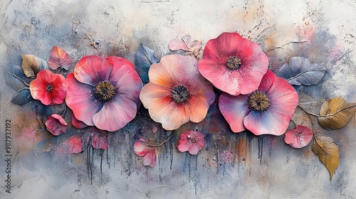 A vibrant floral painting featuring a variety of pink and red flowers set against a soft, textured background.