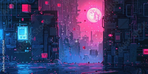 A vibrant, futuristic cityscape illuminated by neon lights and a large moon, evoking a cyberpunk atmosphere.