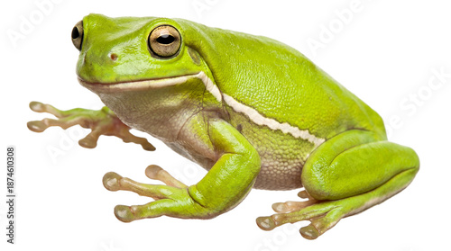 A vibrant green frog sitting on a transparent background with big eyes