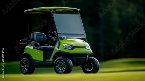 A vibrant green golf cart parked on a lush golf course, surrounded by trees and soft sunlight