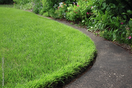 A vibrant green lawn curves alongside a dark pathway, bordered by lush plants and colorful flowers in a peaceful garden.