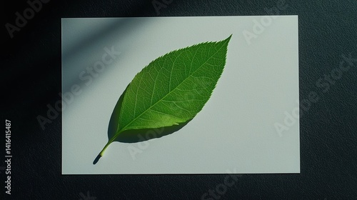 A vibrant green leaf rests on a white background, showcasing its intricate veins and natural beauty, illuminated by soft light.