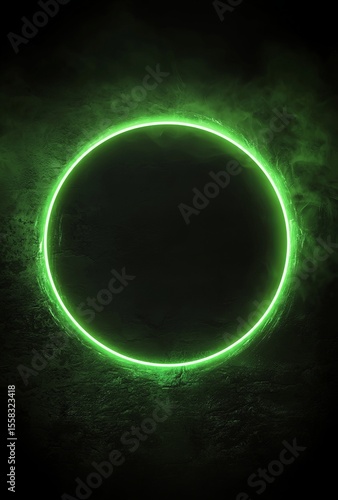 A vibrant green neon circle surrounded by smoke effects set against a dark textured background creates an intriguing and mysterious atmosphere, perfect for modern designs and visuals.