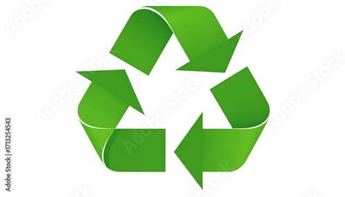 A vibrant green recycling symbol, with flowing arrows, stands out against a stark white background.