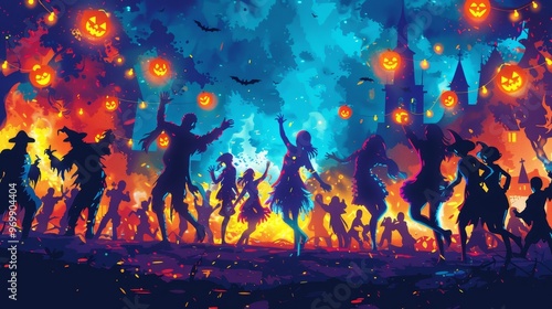 A vibrant Halloween festival scene with dancers, glowing pumpkins, and a spooky atmosphere under a starry night.