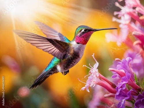 A vibrant hummingbird hovering near colorful flowers in a sunlit garden, capturing the essence of nature's beauty