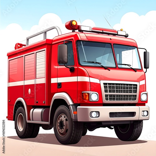 A vibrant, illustrated red firetruck, detailed in style, showcases a sturdy vehicle against a light blue sky with puffy clouds.