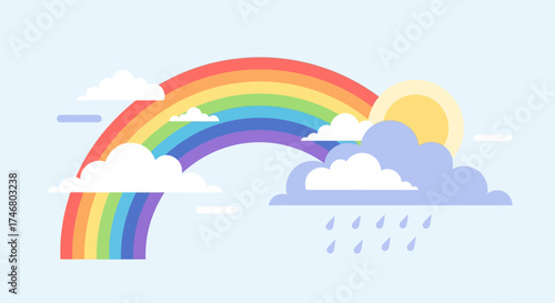 A vibrant illustration features a colorful rainbow arching over clouds, sun, and rain.