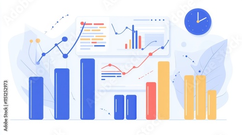 A vibrant illustration of data analysis, featuring colorful bar graphs and line charts on a light background.