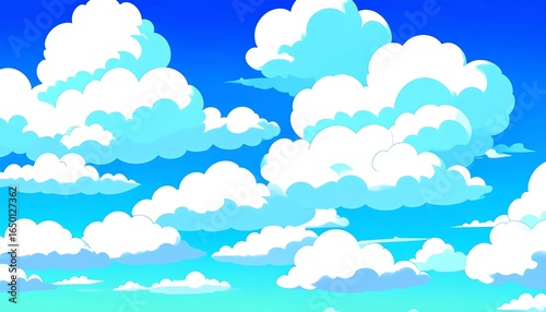 A vibrant illustration of fluffy clouds against a bright blue sky.