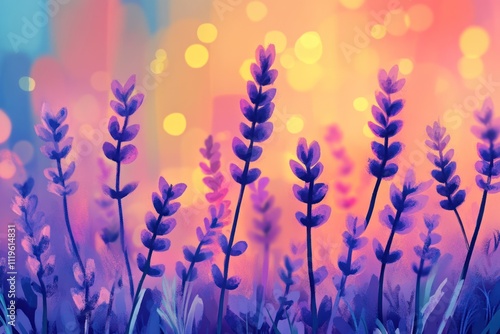 A vibrant illustration of lavender flowers in a field with a blurred city skyline background.