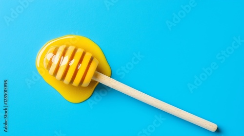 A vibrant image of honey dripping from a wooden dipper, showcasing its rich golden color on a bright blue background. Perfect for food-related projects or healthy lifestyle themes.