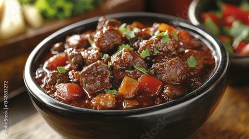 A vibrant medley of tender beef, fiery peppers, and fragrant spices, simmered together in a rich tomato sauce to create a chili con carne that tantalizes the senses.