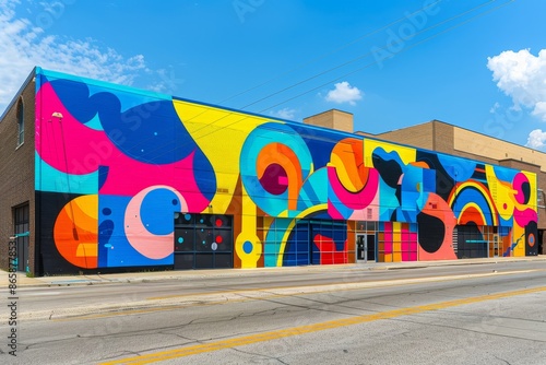 A vibrant mural covers the side of a building, featuring abstract shapes and bold colors that capture the energy and creativity of urban street art