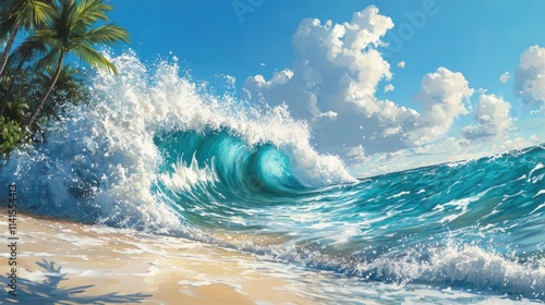 A vibrant ocean wave crashing on a sandy beach under a bright blue sky.