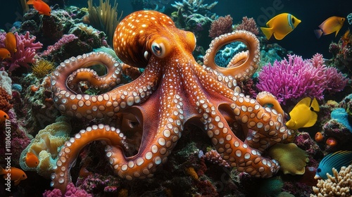 A vibrant octopus amidst coral reef, diverse fish. Showcase ocean life diversity, ideal for marine biology or nature documentaries.